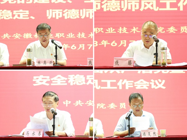 为深入开展学习贯彻习近平新时代中国特色社会主义思想主题教育,严格落实上级部门关于党的建设、全面从严治党、校园安全稳定和师德师风建设等方面的有关精神和部署要求,6月7日下午,院党委组织召开学院2023年党建、全面从严治党暨安全稳定、师德师风工作会议。党委书记林高兴,党委副书记、院长钱滕,院党委委员、副院长马永春、琚昊然出席,学院全体教职工参加会议。会议由林高兴主持。